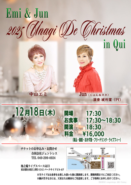 Emi&Jun 2025 Unagi DE Christmas 開場17:30 お食事17:30~ 開演18:30 出演:中山エミ・Jun 演奏:城所 潔(Pf) 料金:16,000円(鰻重・おかず重・フリードリンク・ライブフィー・税込) 場所:池之端ライブスペースQui 住所:東京都台東区上野2-13-2 パークサイドビル4F